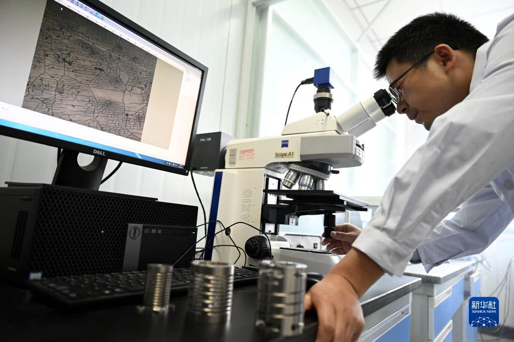 4月19日,在中科院合肥物質(zhì)科學(xué)研究院,固體物理研究所內耗與固體缺陷研究部實(shí)驗師劉旺利用光學(xué)顯微鏡分析阻尼合金的微觀(guān)界面結構。