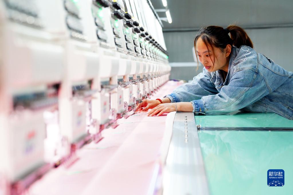 4月22日,在惠民縣桑落墅鎮“惠民工坊”,工作人員在針織機前修剪線(xiàn)頭。