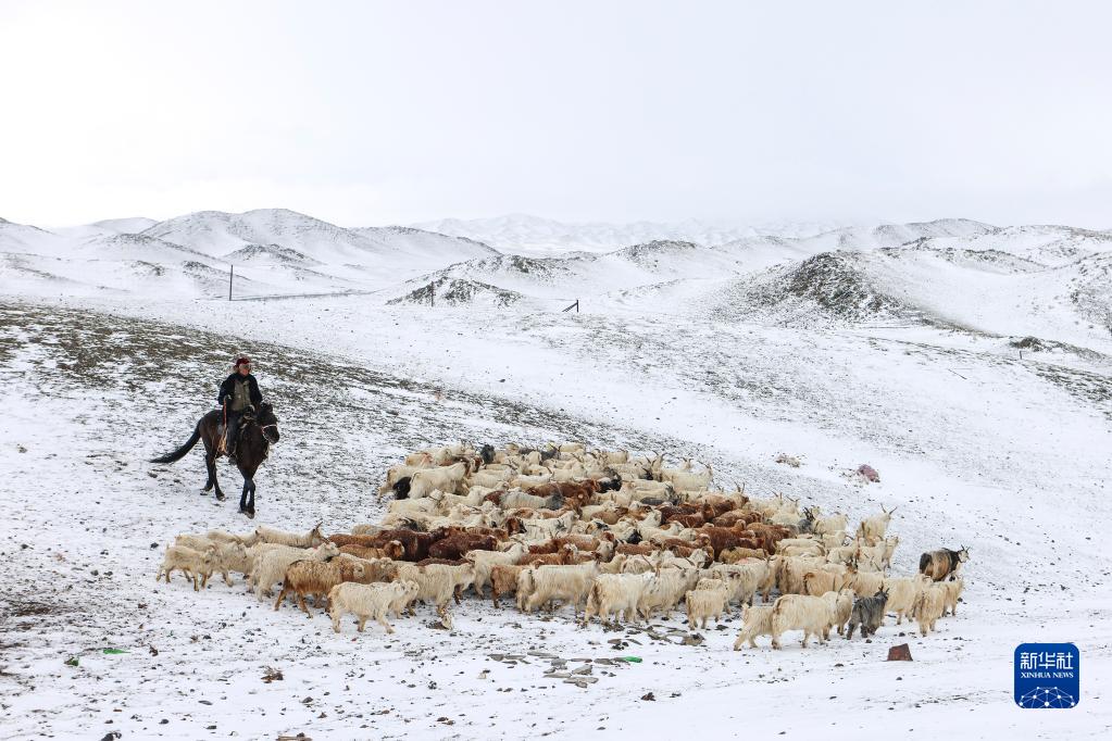 春雪突至,哈布得拉什么在春草場(chǎng)上放牧(4月12日攝)。