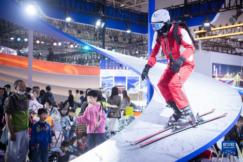 4月22日,觀(guān)眾在遼寧館體驗冰雪運動(dòng)裝備。