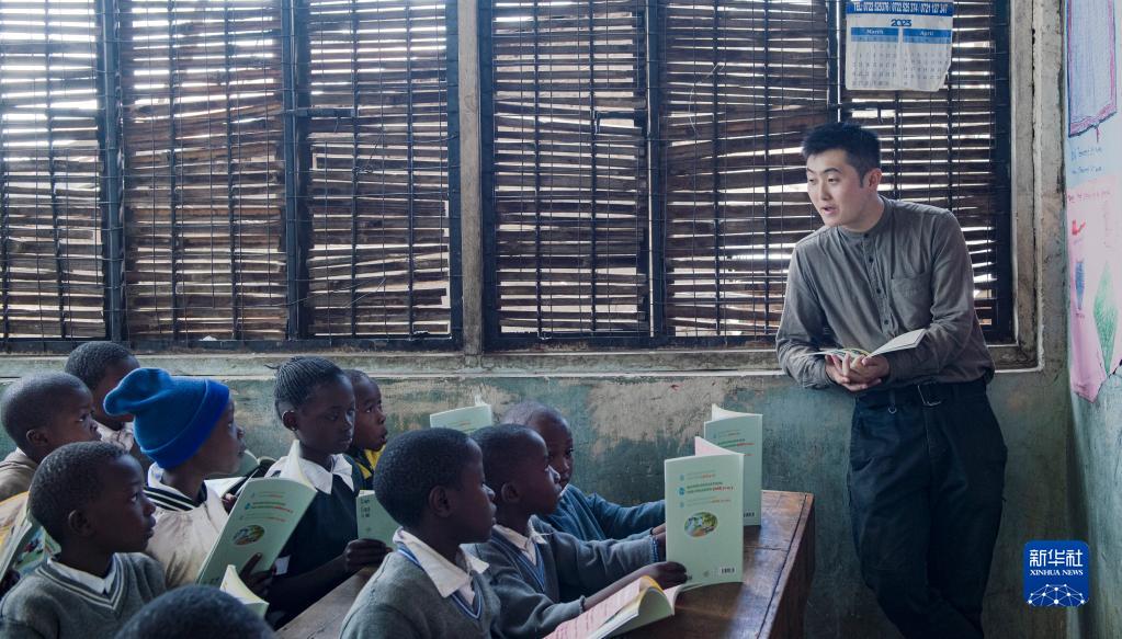 4月19日,在肯尼亞內羅畢馬薩雷貧民區的一所小學(xué),劉宜孟翰為孩子們講解書(shū)本內容。
