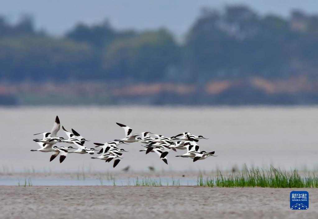 一群反嘴鷸飛過(guò)閩江河口國家濕地公園海面(4月21日攝)。