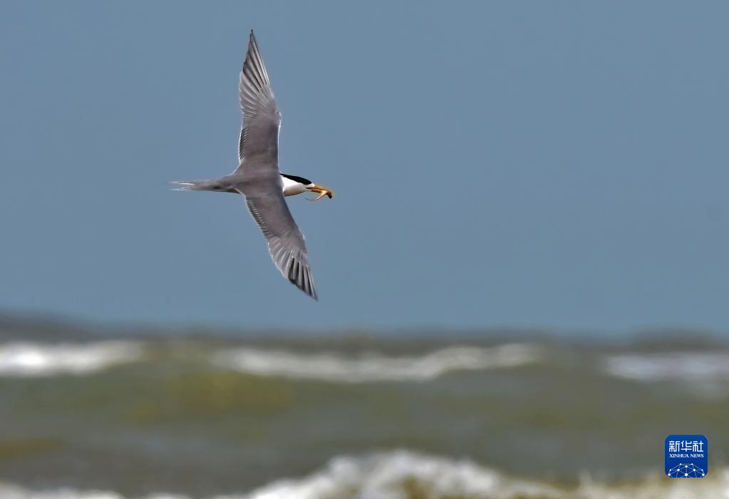 4月22日,一只大鳳頭燕鷗在閩江河口濕地海面上空覓食。