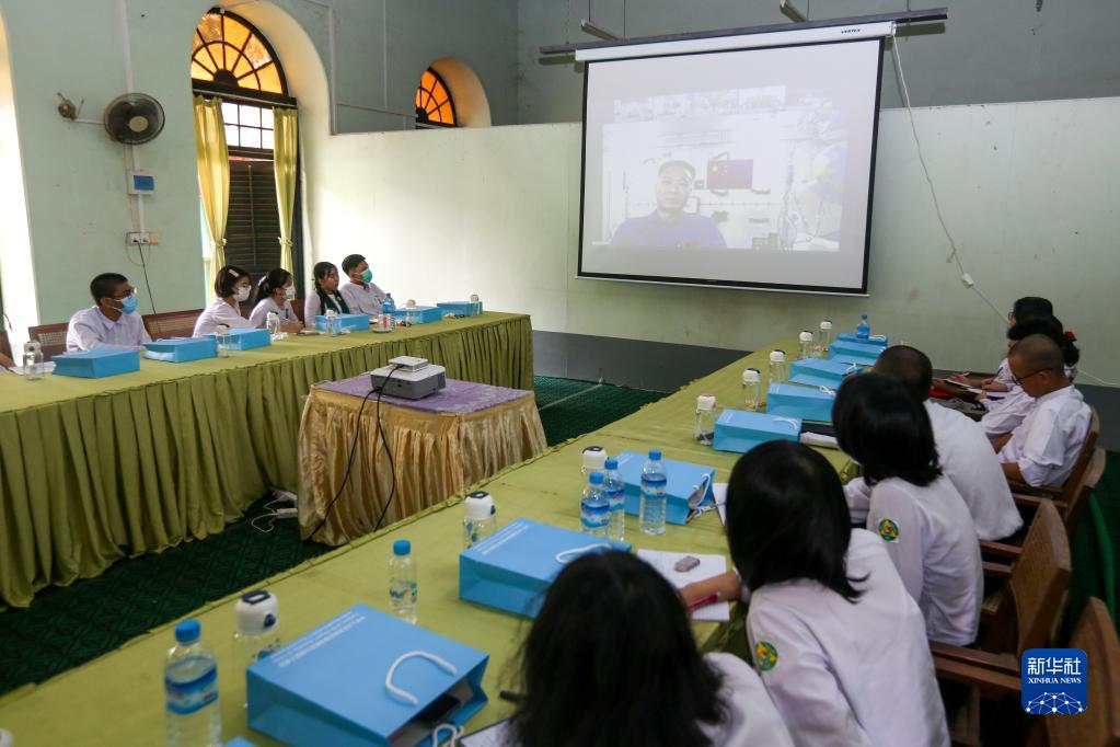 這是4月20日在緬甸仰光一所高中拍攝的“天宮對話(huà)”活動(dòng)線(xiàn)上課堂現場(chǎng)。