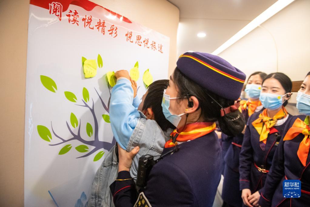 4月23日,在由株洲西發(fā)往上海虹橋的G1348次列車(chē)上,廣鐵集團長(cháng)沙客運段動(dòng)二車(chē)隊舉辦好書(shū)閱讀分享會(huì )活動(dòng),小乘客在列車(chē)上分享閱讀繪本后的感受。