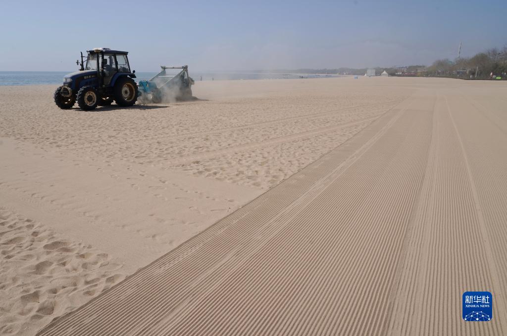 4月23日,工人在秦皇島市海港區金夢(mèng)海灣浴場(chǎng)使用機械設備過(guò)濾海灘上的沙子。