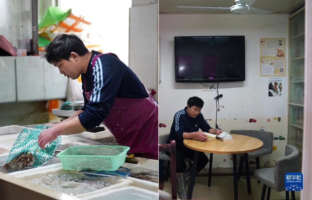 拼版照片:左圖為車(chē)站北菜市場(chǎng)的水產(chǎn)經(jīng)營(yíng)戶(hù)仇明紅在攤位上忙碌;右圖為仇明紅在菜場(chǎng)書(shū)屋內閱讀,他是這間菜場(chǎng)書(shū)屋里借閱量最高的攤主之一(4月19日攝)。