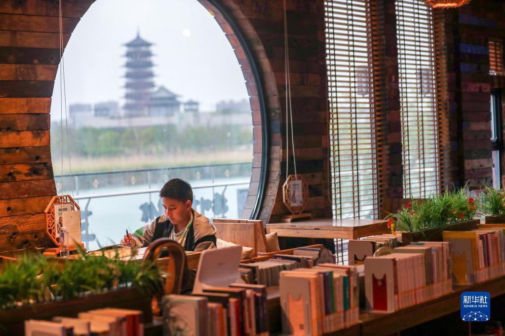 4月22日,一名小讀者在江蘇省揚州市運河三灣公園內的城市書(shū)房閱讀。