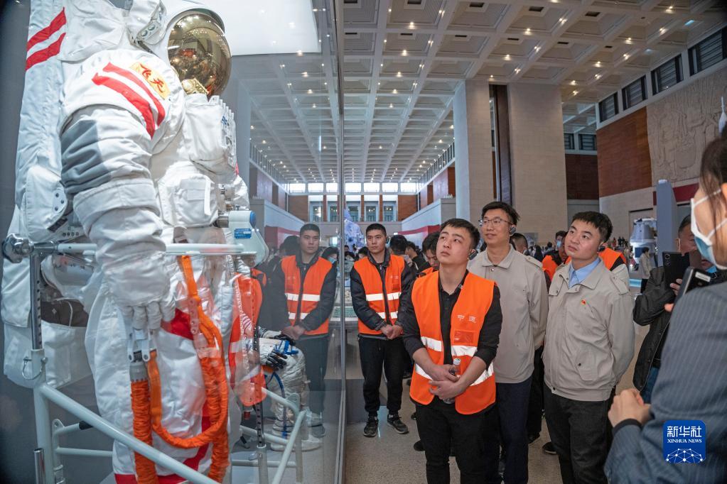 4月23日,中建三局順義航天產(chǎn)業(yè)園項目一線(xiàn)建設者在參觀(guān)“逐夢(mèng)寰宇問(wèn)蒼穹——中國載人航天工程三十年成就展”。