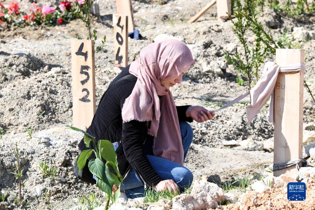 4月23日,一名女子在土耳其哈塔伊一處墓地悼念在地震中遇難的親人。新華社發(fā)(穆斯塔法·卡亞 攝)