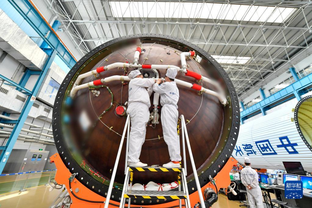 在航天科技集團一院天津火箭公司總裝測試車(chē)間,班組人員在進(jìn)行火箭裝配(4月19日攝)。