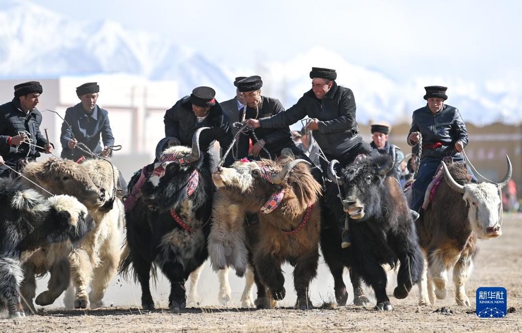 新疆塔什庫爾干塔吉克自治縣,選手在肖貢巴哈爾節開(kāi)幕式上進(jìn)行“牦牛叼羊”比賽(3月21日攝)。肖貢巴哈爾節是塔吉克族的傳統節日,有“新年”“迎春”之意。