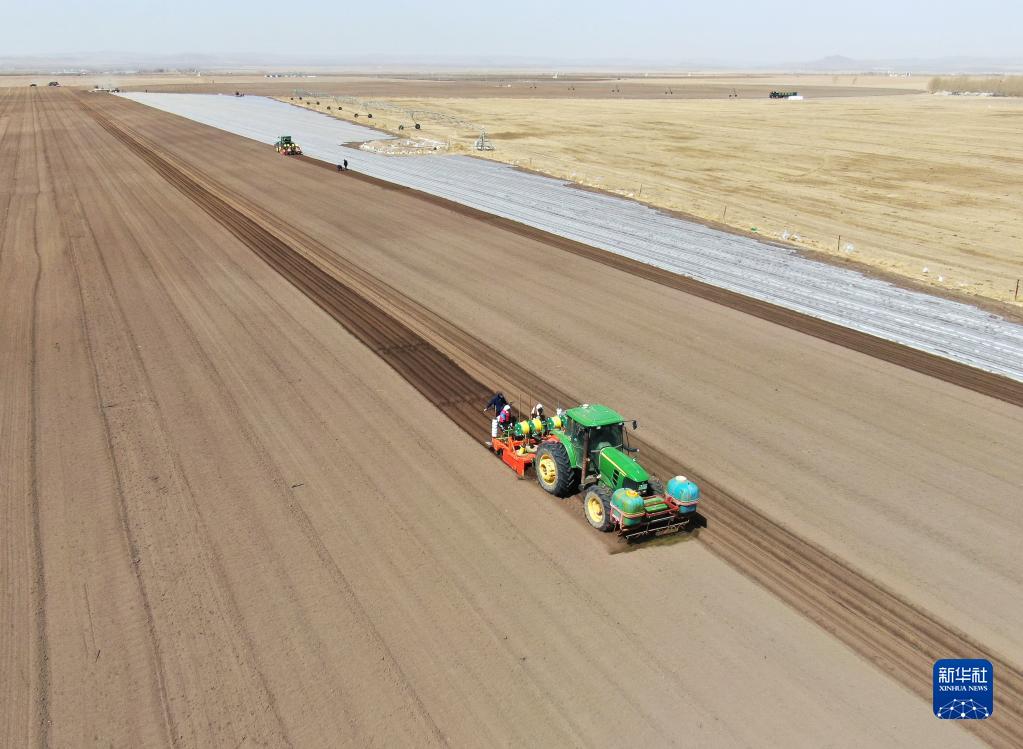 4月24日,工作人員操作機械設備在塞北管理區農業(yè)基地播種胡蘿卜(無(wú)人機照片)。