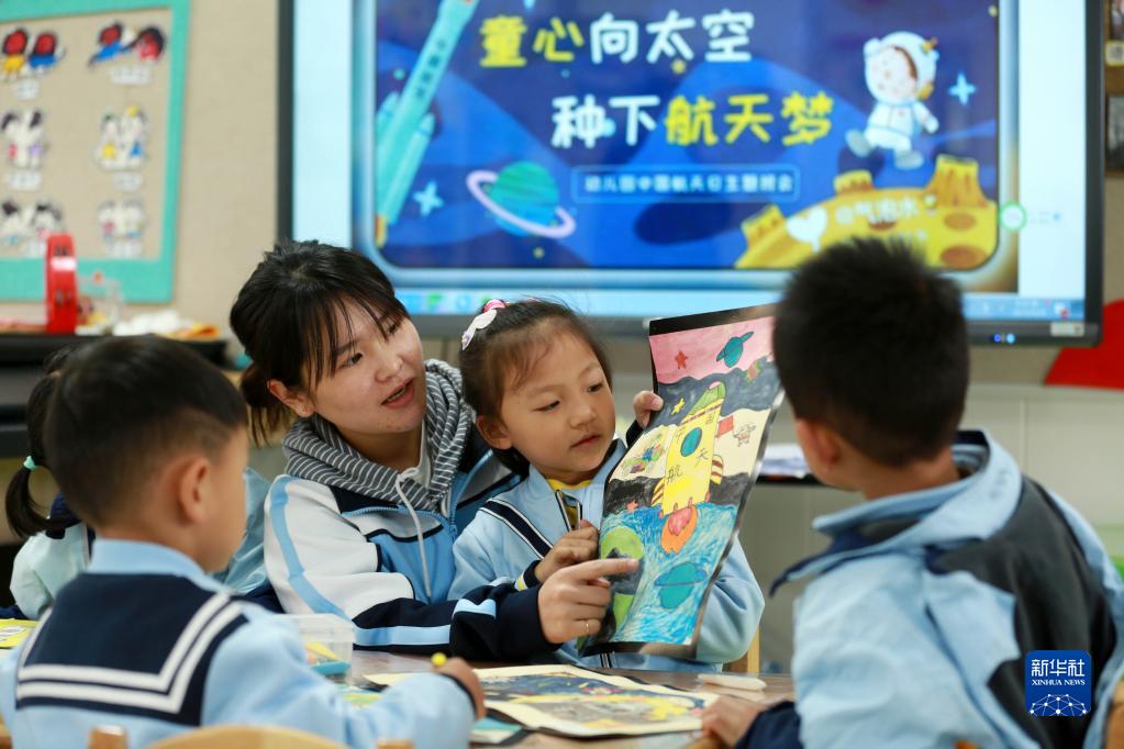 4月24日,在貴州省黔南布依族苗族自治州都勻市青云湖幼兒園,孩子們介紹自己創(chuàng )作的航天主題彩繪作品。