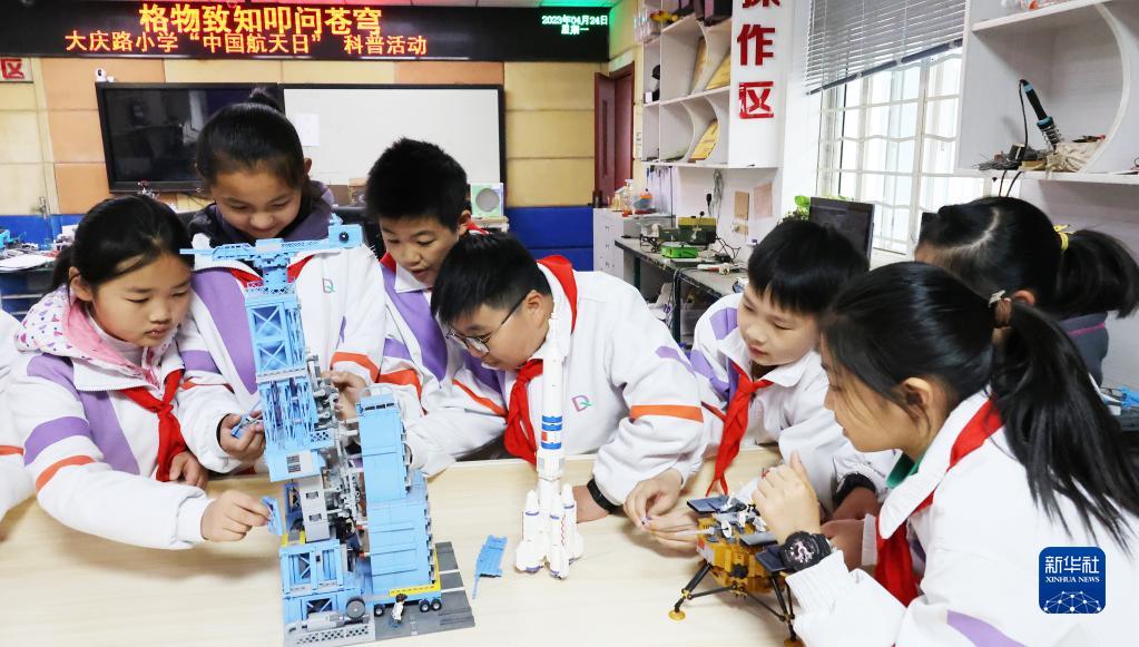 4月24日,在江蘇省連云港市海州區大慶路小學(xué),科技社團的學(xué)生組裝航天器模型。