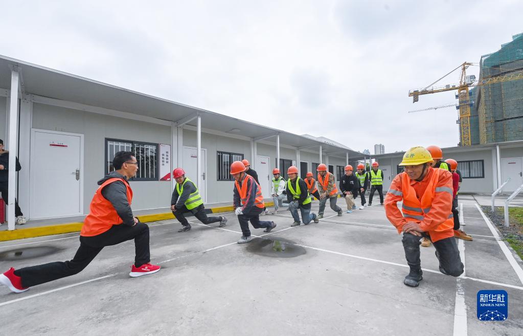 4月25日,社區工作人員帶領(lǐng)工地勞動(dòng)者學(xué)習簡(jiǎn)單的放松操。