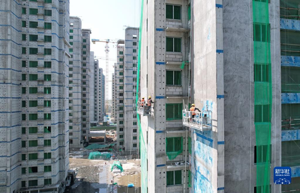 4月25日,中鐵二十局的工人在石家莊市高新技術(shù)產(chǎn)業(yè)開(kāi)發(fā)區集中安置區棚戶(hù)區改造項目建設工地施工(無(wú)人機照片)。