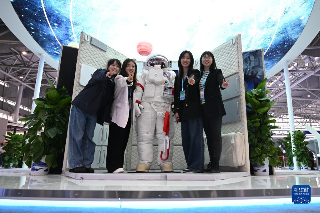4月24日,觀(guān)眾在科普展區內與航天服模型合影留念。