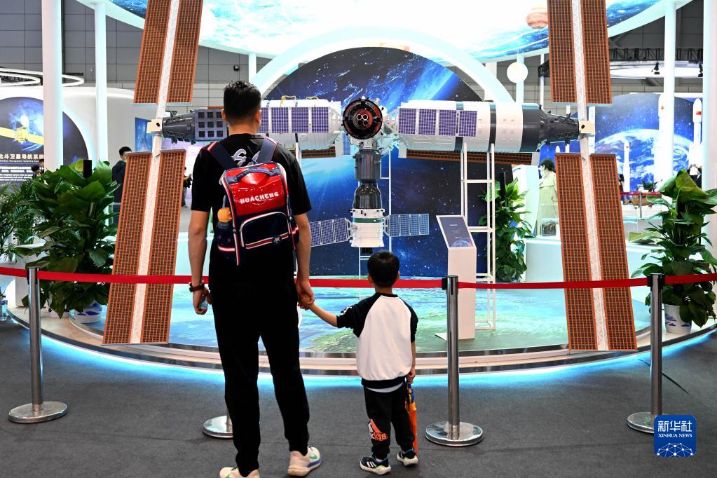 4月24日,觀(guān)眾在科普展區參觀(guān)空間站組合體模型。