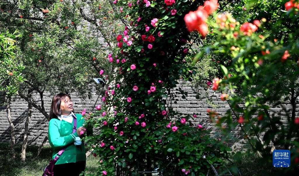 市民在西安明城墻下的環(huán)城公園內賞花(4月25日攝)。