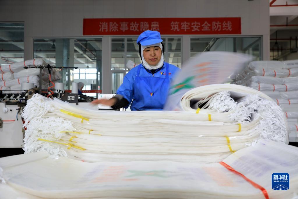 4月25日,在山東省臨沂市臨沭縣一塑編企業(yè)車(chē)間,工人加工塑編產(chǎn)品。