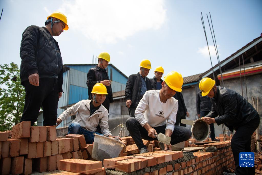 4月25日,在大鯨港鎮五合剅社區,工人在實(shí)操砌墻。