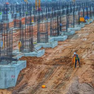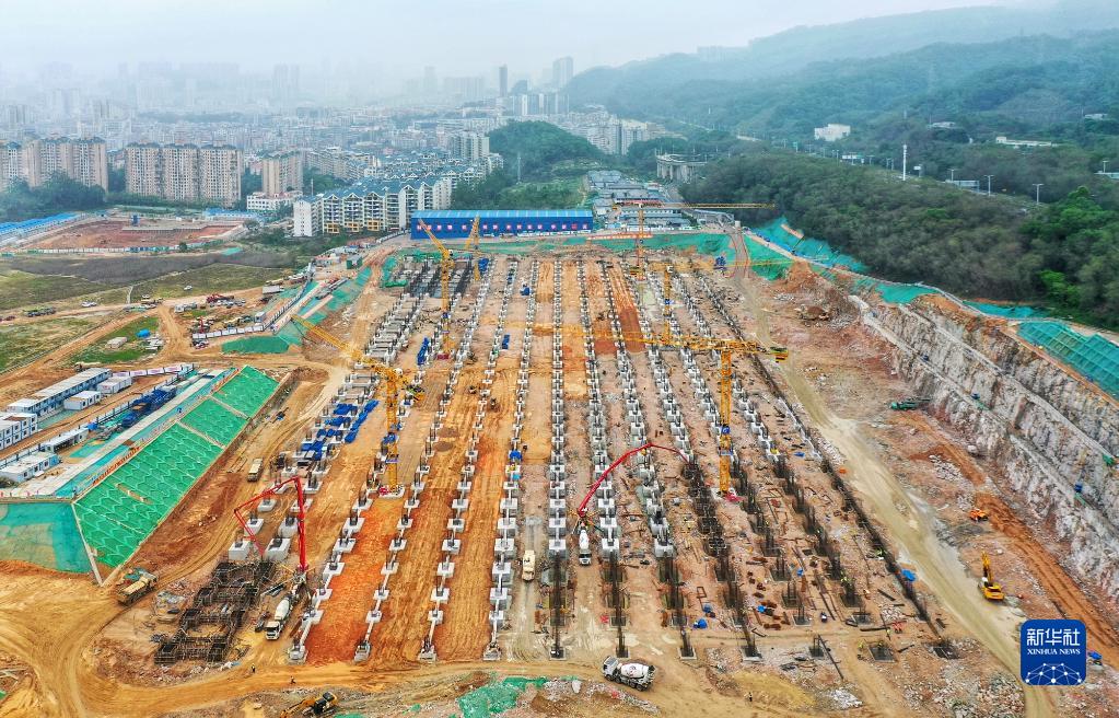 建設中的深圳地鐵5號線(xiàn)上水徑停車(chē)場(chǎng)正在進(jìn)行底板獨立基礎混凝土澆筑和鋼筋籠綁扎作業(yè)(4月25日攝,無(wú)人機照片)。
