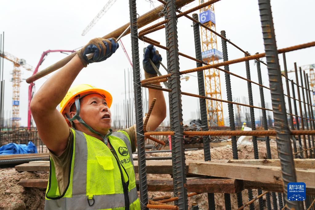 中鐵上海工程局施工人員在深圳地鐵5號線(xiàn)上水徑停車(chē)場(chǎng)建設現場(chǎng)綁扎底板獨立基礎鋼筋籠(4月25日攝)。