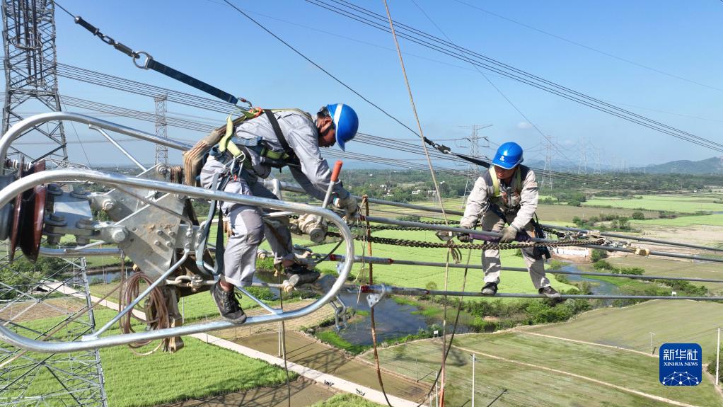 電力工人劉李家(左)、王春龍在塔上作業(yè)(4月20日,無(wú)人機照片)。