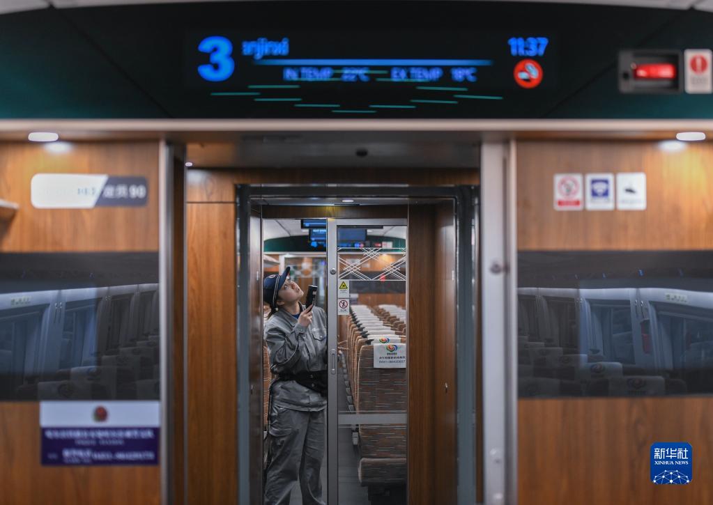 在哈爾濱動(dòng)車(chē)段整備庫,機械師屈虹池在動(dòng)車(chē)組車(chē)體內檢查部件狀態(tài)(4月25日攝)。