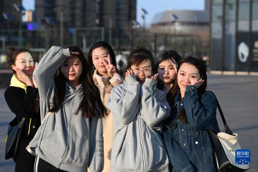 在哈爾濱市一廣場(chǎng),“雪絨花”女子班組部分成員在通勤車(chē)到站下車(chē)后合影、拍照(4月23日攝)。