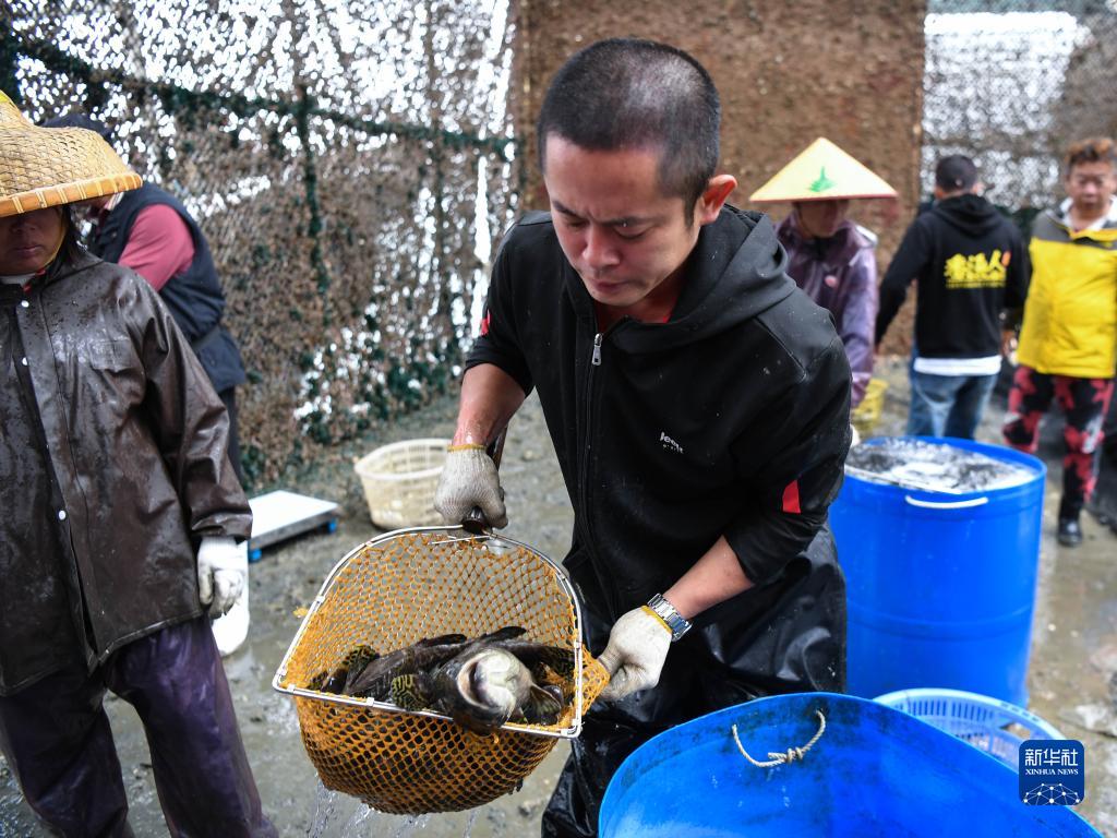 在廣東珠海萬(wàn)山海域,中國首臺半潛式波浪能養殖旅游平臺“澎湖號”上,工作人員裝載剛捕撈的石斑魚(yú)(4月25日攝)。