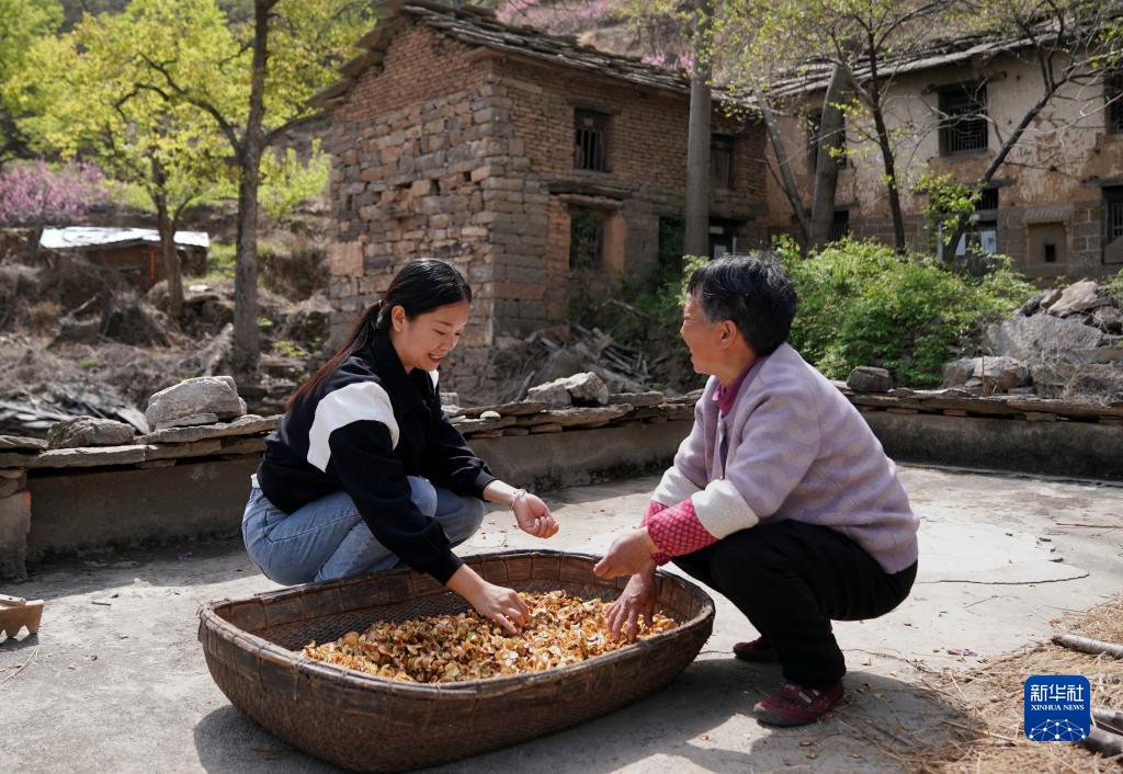 陳曉麗(左)幫村民胡金英晾曬蘋(píng)果干(4月18日攝)。新華社記者 李安 攝