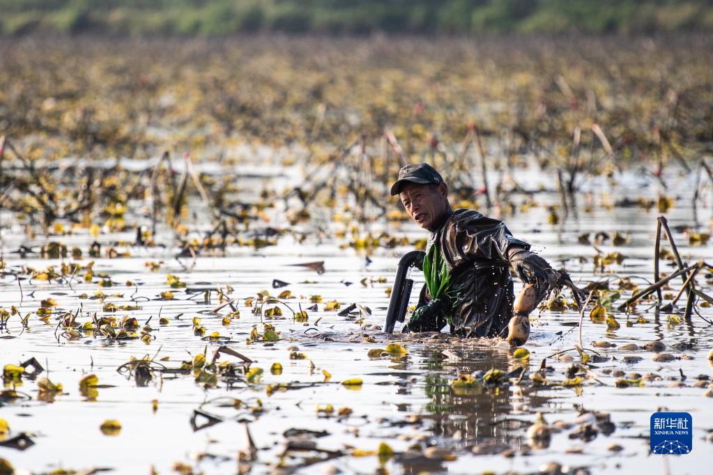 4月26日,藕農在南縣中魚(yú)口鎮菱角湖村的荷塘中采挖蓮藕。