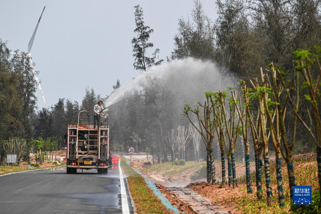 4月25日,工人在海南環(huán)島旅游公路東方段為新種的樹(shù)木澆水。