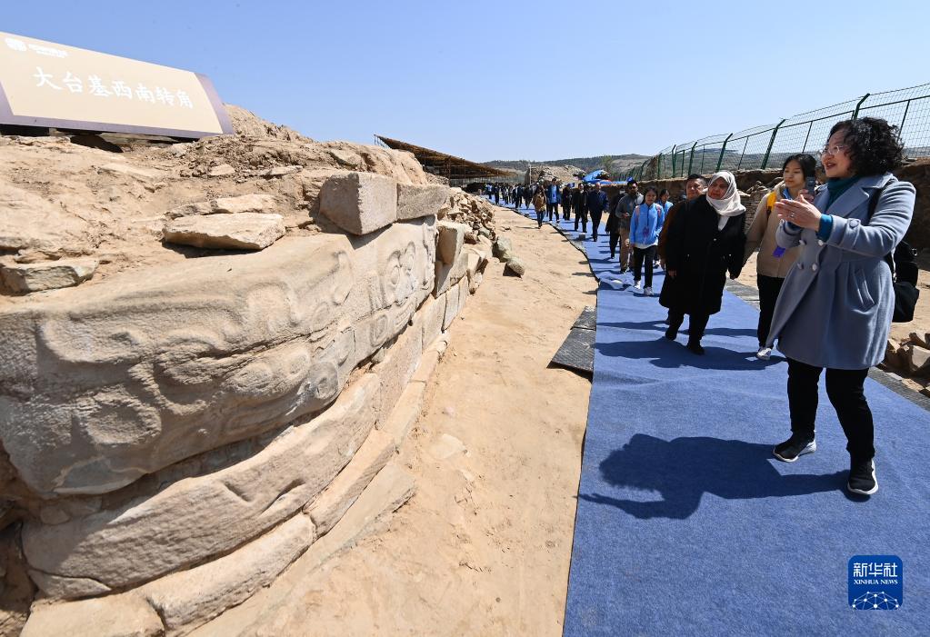 4月26日,外賓在陜西石峁遺址皇城臺遺址大臺基西南轉角參觀(guān)建筑浮雕。