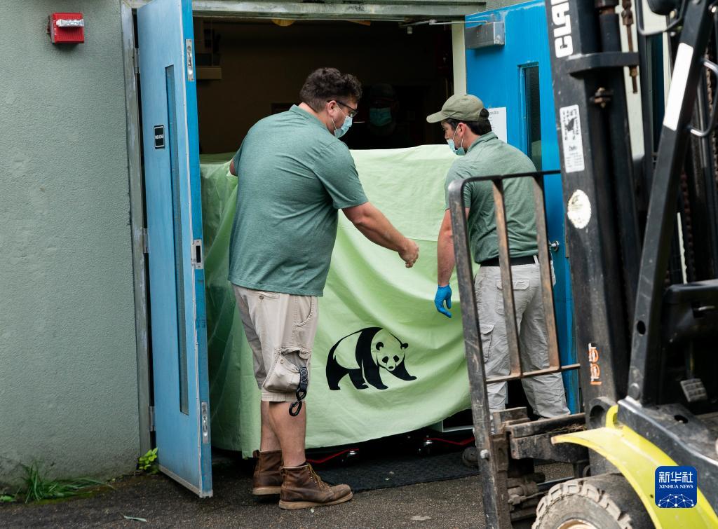4月26日,工作人員在美國田納西州孟菲斯動(dòng)物園搬運裝載大熊貓“丫丫”的箱籠。