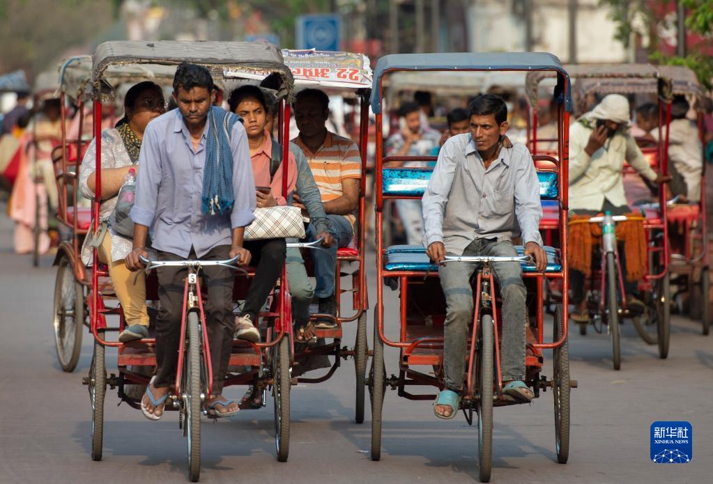 4月26日,人力三輪車(chē)夫在印度新德里的一處市場(chǎng)載客。
