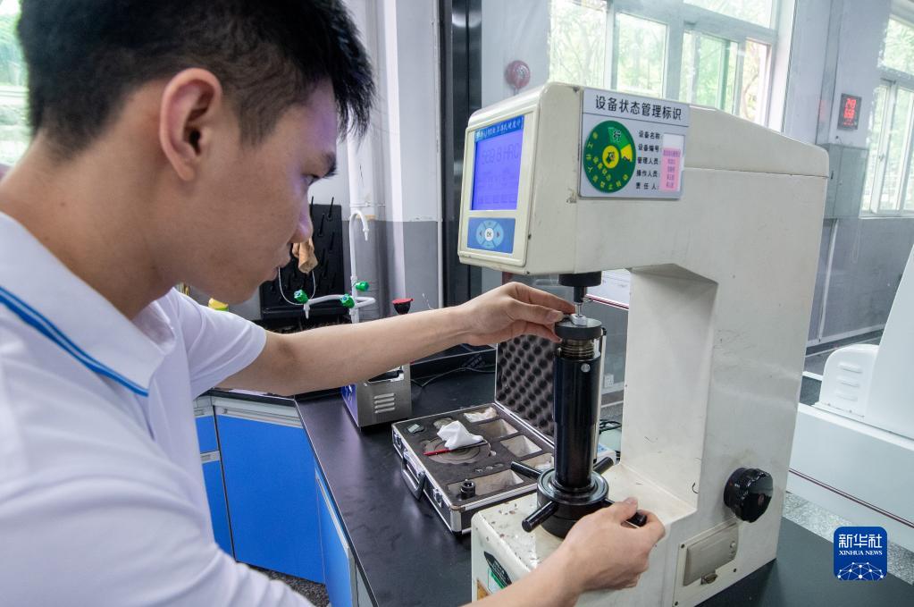 4月13日,在深圳市喜德盛自行車(chē)股份有限公司實(shí)驗室,工作人員在檢測自行車(chē)零件吊耳的硬度。