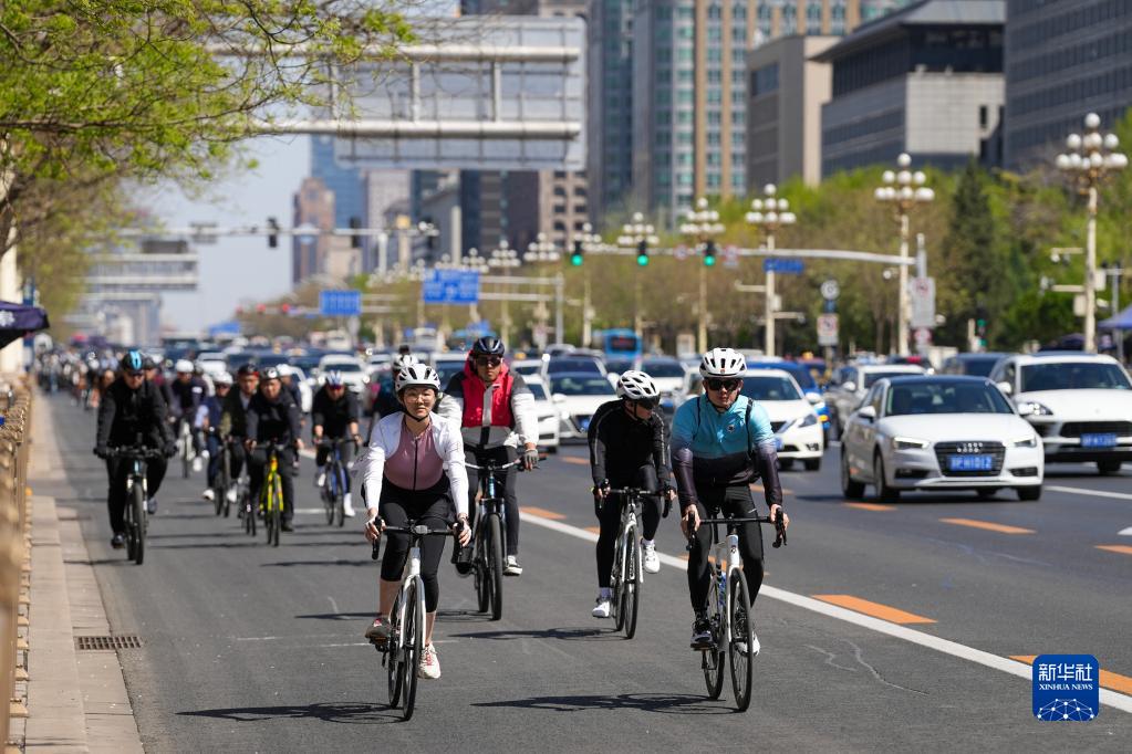 4月8日,騎行愛(ài)好者彭達(右一)和“花young”戶(hù)外車(chē)隊隊員在北京長(cháng)安街上騎行。