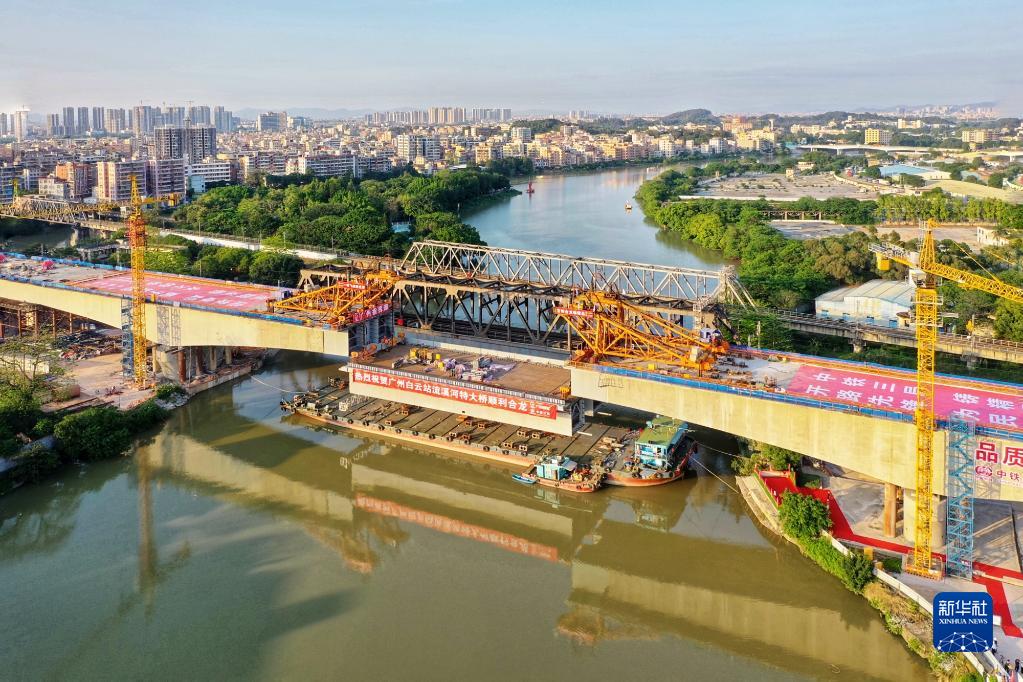流溪河特大橋重達千噸的鋼箱梁主梁進(jìn)行吊裝作業(yè)(4月26日攝,無(wú)人機照片)。