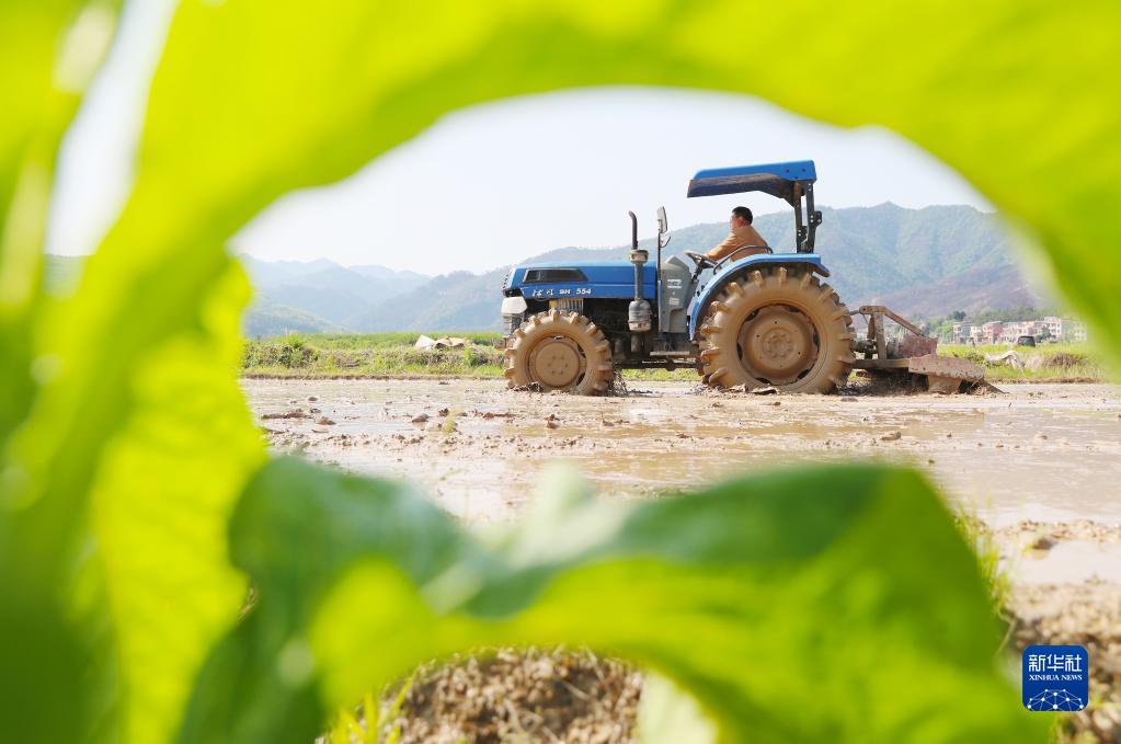 4月26日,農機手在湖南省永州市新田縣驥村鎮陸家村駕駛農機翻耕農田,為早稻插秧作準備。