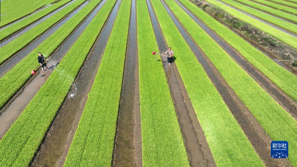 4月27日,在四川省眉山市仁壽縣珠嘉鎮,農民在管護水稻秧苗(無(wú)人機照片)。