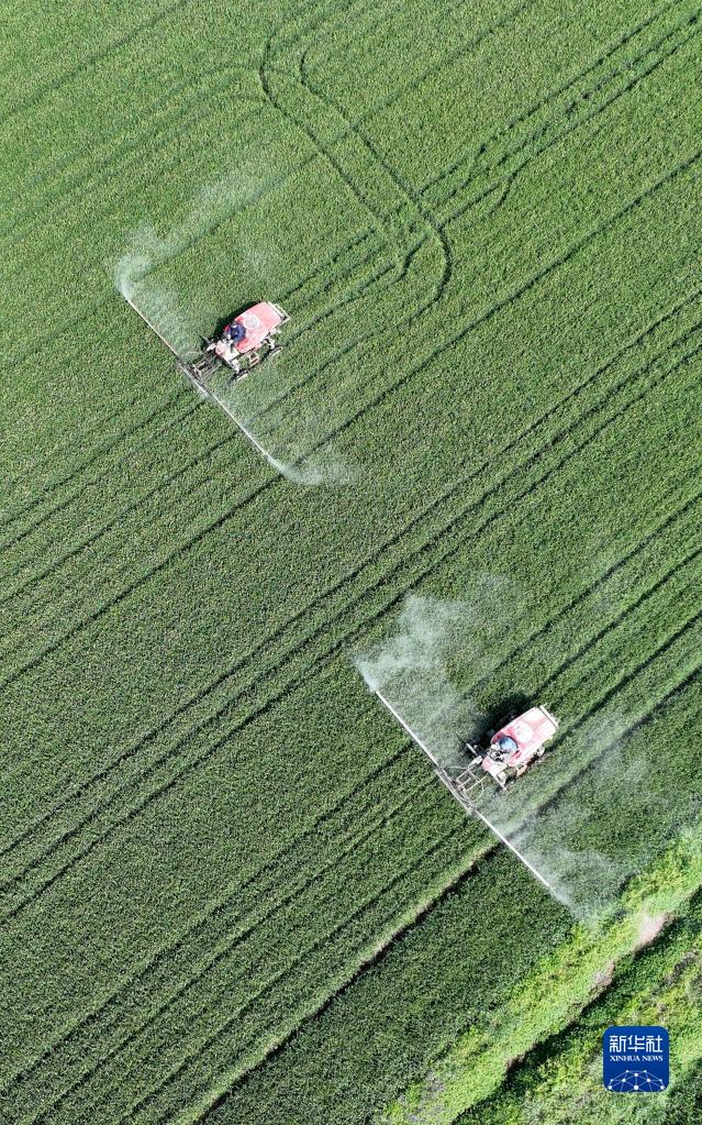 4月26日,在江蘇省淮安市洪澤區三河鎮,農民駕駛植保機械對小麥實(shí)施噴防作業(yè)(無(wú)人機照片)。