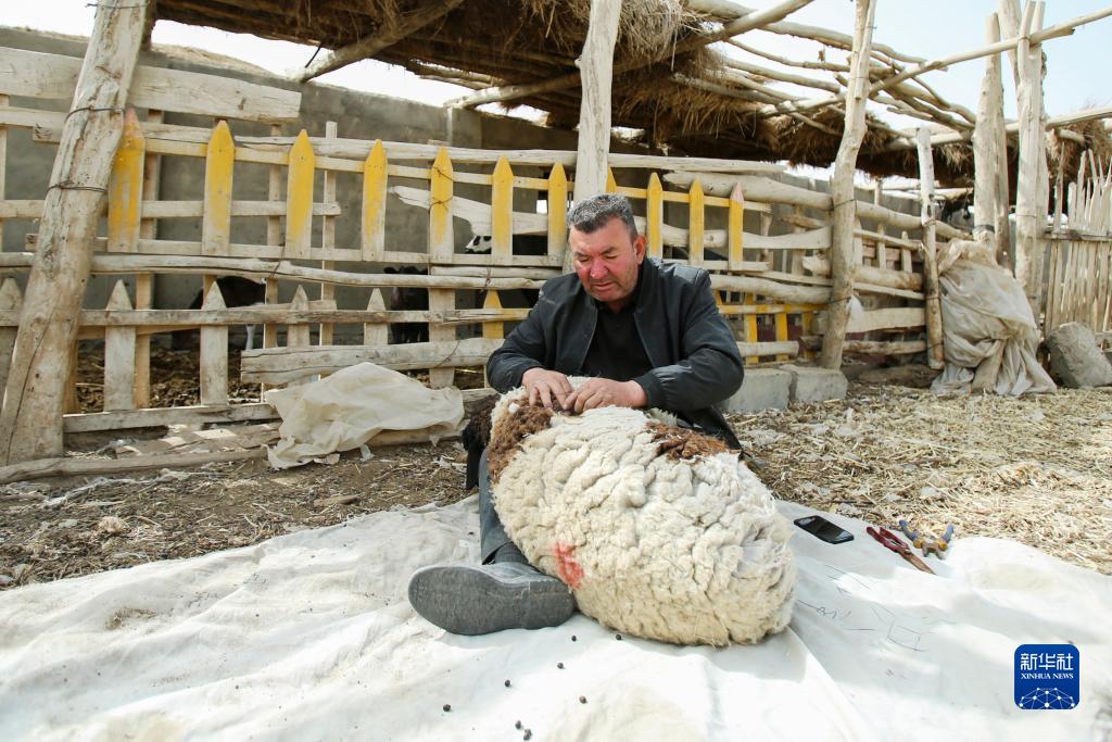 新疆尉犁縣巴西買(mǎi)里村,在棉田旁的羊圈里,爾肯·熱衣木在剪羊毛(3月29日攝)。