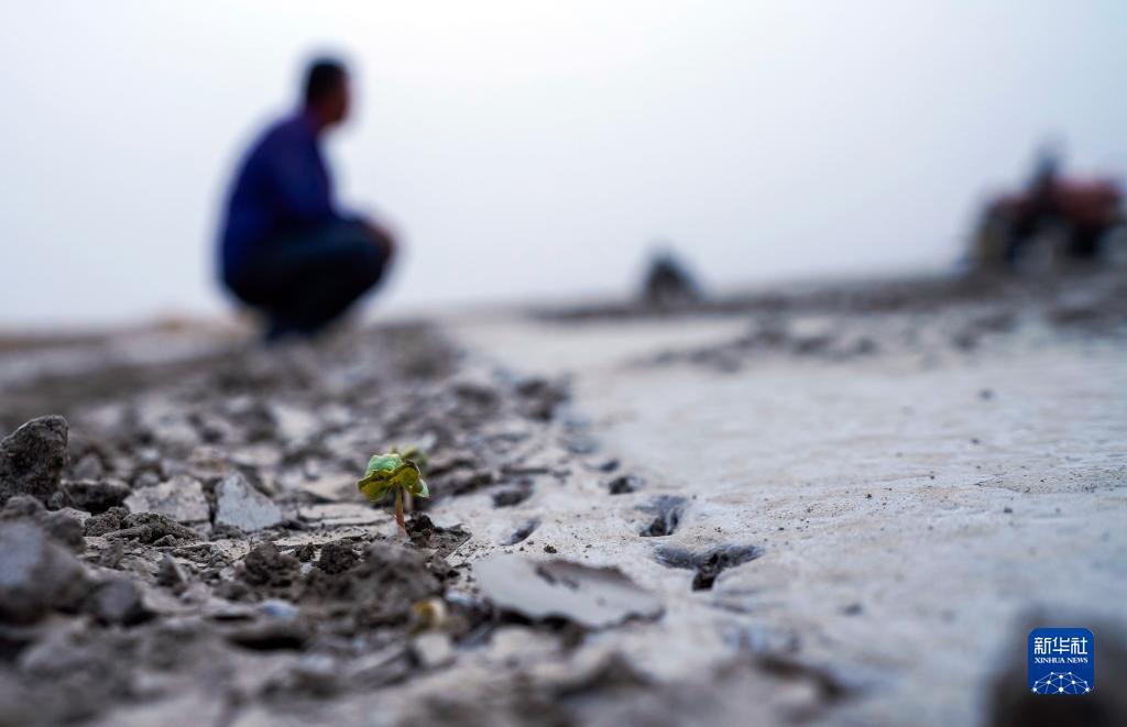 新疆尉犁縣巴西買(mǎi)里村,天色漸暗,爾肯·熱衣木蹲在棉田里,看著(zhù)拖拉機來(lái)回作業(yè),盼著(zhù)田里的棉花嫩芽全部成活(4月21日攝)。