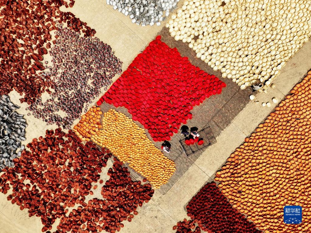 4月26日,在臨沭縣騰奧工藝品有限公司院內,工作人員在晾曬柳編產(chǎn)品(無(wú)人機照片)。