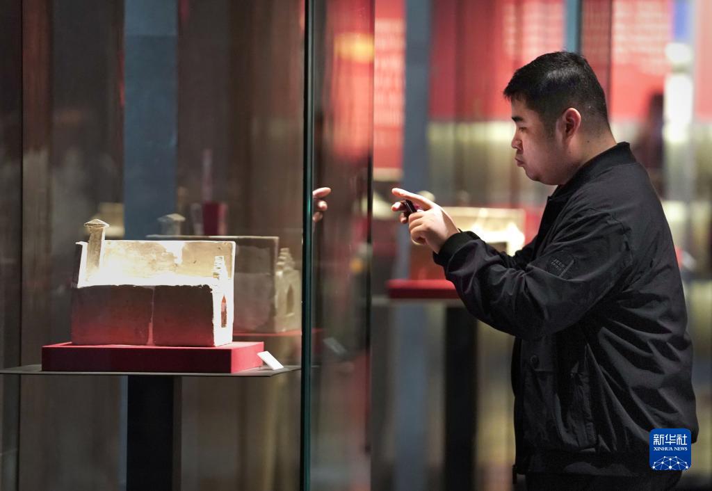 4月27日,參觀(guān)者在曹操高陵遺址博物館內拍攝展品。