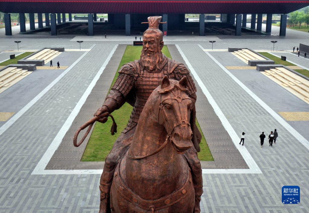這是4月24日拍攝的曹操高陵遺址博物館的“魏武揮鞭”塑像(無(wú)人機照片)。