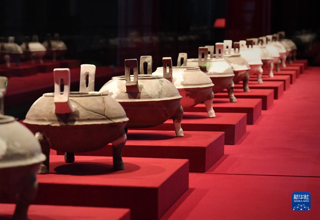 這是曹操高陵遺址博物館內展出的陶鼎(4月22日攝)。